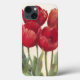 Canção de natal Rowan/Apple selvagem do ©. Um grupo do rubi coloriu tulipas com folhas e hastes. A imagem tem um fundo branco liso.