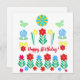Feliz Cartão Floral de Aniversário no estilo escandinavo. Tulipas amarelas com flores vermelhas, azuis e borboletas.