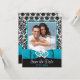 Se você encontrou o amor da sua vida e quer convidar toda a sua família e amigos para testemunhar a junção de suas duas vidas e corações então esse lindo casamento modelo de foto salve o cartão de data em preto e branco com corações unidos sobre uma fita azul teal ou turquesa e a imagem do arco correndo pelo fundo é uma forma excelente de anunciar seus próximos nuptiais. O lado frontal tem um padrão de fundo damasco preto e branco ao redor de sua foto de noivado acima da fita enquadrada em turquesa, preto e branco. As palavras "Salvar a Data" e a data do casamento são impressas abaixo da fita em um fundo preto em branco e azul-turquesa. A parte de trás tem a mesma design que a parte da frente com seus detalhes de casamento impressos em uma área de texto branco em turquesa e preto. O texto do website de casamento e um código QR que você trocar por seu próprio também estão incluídos se você tiver um site de casamento que você quer que o pessoas visite através de um código QR. Se precisar de ajuda ou se quiser que um imã salve a data, envie seu pedido por e-mail para niteowlstudio@gmail.com ou use o recurso de bate-papo Zazzle para entrar em contato.