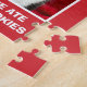 Este bonitinho quebra-cabeça de Natal de um tuxedo apresenta uma fotografia de um gato de smoking com a língua vestindo um arco de Natal. Abaixo da fotografia estão as palavras "Alguém comeu Cookies Papais noeis." Este é um quebra-cabeça excelente para o amante do gato. Copyright peachesthetuxedocat