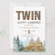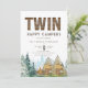 Este divertido convite rústico tem uma madeira chamada "TWINS" e campers felizes. O fundo tem uma floresta aquosa, montanhas e paisagem. É finalizado pelos elementos de acampamento bronzeado, verde e castanho que incluem duas tendas muito bonitas representando dois bebês e uma lareira. O dorso tem um padrão da mesma tenda de aquarela.