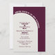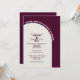 A very modern wedding invitation on a burgundy background with a Cloud Dancer white arch shape frame of the details.