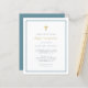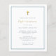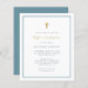 Simples convites de primeira comunhão com cruz falsa de folha de ouro e caligrafia com elegante tipografia moderna em fundo branco com uma borda azul. Como parte da seleção do orçamento aqui no Zazzle, esses convites vêm em tamanhos limitados e estoques de papel. Se você precisar de um tamanho ou estoque de papel diferente, esse design pode ser transferido para um formato padrão 5x7 usando a ferramenta de transferência design para obter mais opções.