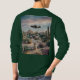 Esta é uma camiseta digital UFO Desert Flowers. A foto digital foi criada com arte gerativa. A foto apresenta uma paisagem desértica com plantas, cactos e flores. O céu tem nuvens macios. Uma nave espacial está pairando no centro. Há um gato bonito com um colar verde na frente. A camiseta é uma camiseta verde comprida masculina. A imagem está na frente e atrás da camiseta.
