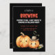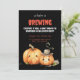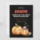O contexto do convite é uma combinação assustadora, mas encantadora, de preto e laranja, estabelecendo a vibração perfeita do Halloween. No fundo há uma ilustração fofa e um pouco maliciosa de 2 Bombeiros. O texto está escrito em uma fonte estranha, mas convidativa, e ele diz: um bebê está Criando Chá de fraldas! Um Bebê do Dia das Bruxas está se preparando!