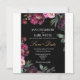 Um buquê floral de rico, dramático e moody peony design. Esta design salva-a-data é ousada e dramática, acrescentando mais do que um toque de glamour a qualquer celebração de casamento. Os florais profundos e modernos evocam uma atmosfera romântica contra o pano de fundo negro noturno.