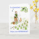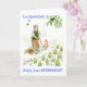 Um cartão de boas intenções de aposentadoria para um avô, com um homem gostando de ouvir a canção de pássaros enquanto tende a mancha vegetal. O gato olha e borboletas saem ao sol, de uma pintura aquosa de Judy Adamson. O dentro é o vazio deixado para a sua própria mensagem.