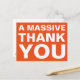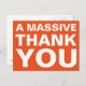 Um cartão postal de agradecimento enorme com fontes grandes modernas em um fundo de cor brilhante.