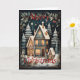 Um cartão de saudação de casas e árvores com neve e estrelas ao fundo. O fundo é um azul-fumo escuro. As palavras Feliz Natal são feitas de cor vermelha.