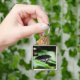 Uma fotografia de uma borboleta preta sobre folhas num jardim.