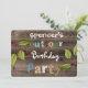 Um divertido convite de aniversário rústico com uma cerca de madeira e folhagem. Adicione o nome à frente. A parte de trás é uma ilustração divertida de um cenário ao ar livre com informações da festa.