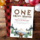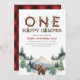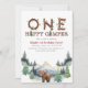 Convide os convidados para uma aventura de aniversário com este primeiro convite de aniversário do "One Happy Camper". Projetado com árvores de floresta, tendas e letras no estilo acampamento, é perfeito para uma celebração rústica, ao ar livre ou com temas de floresta.