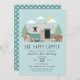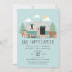 Celebre o dia especial do seu docinho com este design de aniversário de um primeiro aniversario de Camper Feliz. A design apresenta um campista e lindos animais florestais. O inverso é um padrão de pontos de polca brancos. Você pode personalizar isso ainda mais clicando no botão "PERSONALIZAR".