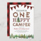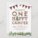 Prepare-se para uma aventura selvagem com este convite de primeiro aniversario "Um Camper Feliz". Apresentando uma tenda acolhedora, pinheiros, e ousadas inscrições rústicas, é a maneira perfeita de convidar convidados para a celebração do templo exterior da sua pequena campista.