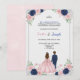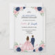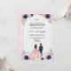 Um convite com tema floral com um casal de costas, a mulher em um vestido rosa e o homem em um terno azul. Detalhes do texto de um evento para Sophia e Joseph