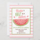 Um em um convite de aniversário de melão para uma primeira festa de aniversário de melancia! Inclui uma ilustração da melancia de cor-de-água rosa doce e verde. © 2021 Tea Olive Co.
