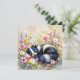 Um cartão de vazio com um adorável e adorável gambá dormindo em uma cama de flores rosa e amarelas.