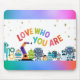 Um mouse pad para crianças dizendo "Ame quem você é" como motivação para eles enquanto é fofo e glorioso.