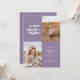 Este anúncio de graduação moderno contém as palavras "começa um novo capítulo" no canto superior esquerdo do cartão, em fundo lilático. Tem espaços para duas fotos verticais para celebrar sua jornada de formando até agora, uma foto do passado e uma foto do presente. A frente do cartão tem espaço para o nome do formando, ano de aula, escola e planos futuros. A parte traseira do cartão tem espaço para texto adicional e pode ser usada como convite de festa de formatura ou para escrever uma mensagem pessoal.