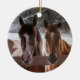 Um ornamento com fotografia de dois cavalos num fundo de inverno.