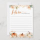 Adicione um toque de charme no outono ao seu evento com nosso **A Little Pumpkin Fall Chá de fraldas Advice Card**. Este cartão encantador convida os hóspedes a partilharem a sua sabedoria e os seus votos de felicidades para os novos pais, fazer que seja um bem-estar apreciado. Com seu design de abóbora fofo e cores com tema de queda, ele complementa perfeitamente qualquer chá de fraldas de outono. Cada cartão proporciona amplo espaço para conselhos sinceros e dicas ponderadas. É uma maneira maravilhosa de coletar mensagens significativas que os futuros pais vão tesourar por anos.