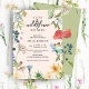 Um tema de chá de fraldas floral de flor silvestre perfeito para uma mamãe a ser? Este belo floral silvestre apresenta um belo buquê de flores silvestres em vermelho, amarelo, esbranquiçado e azul, borboletas de flores silvestres de aquarela sobre fundo de pêssego. No verso, você encontra um padrão floral fofo com um fundo verde.