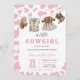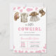 Celebre a chegada do seu garotinho com o nosso Convite de Chá de fraldas A Little Cowgirl! Este convite apresenta charmosos pontos cor-de-rosa, trazendo um toque lúgubre e feminino ao tema clássico ocidental. Roupas adoráveis de vaquinha, um chapéu, e botas minúsculas penduradas em uma linha, acrescentando um talento caprichoso e rústico. Perfeito para um chá de fraldas inspirado no rodeio ou no tema ocidental, este convite é ideal para acolher sua pequena vaquinha no estilo. BBS720