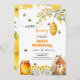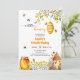 Um tema de aniversário doce com abelhas, jarro de mel, colmeia e flores amarelas na frente e atrás! Você pode personalizar este convite com seus próprios detalhes.
