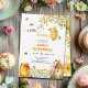 Um tema de aniversário doce com abelhas, jarro de mel, colmeia e flores amarelas na frente e atrás! Você pode personalizar este convite com seus próprios detalhes.