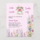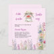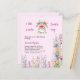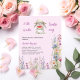Um fundo de rosa claro. Decorado com um belo coelhinho vestindo um chapéu de sol e comendo melancia. Flores selvagens roxas, azuis, cor-de-rosa. Personalize e adicione o nome da mãe a ser e os detalhes da festa. Texto: Um Docinho está a caminho. 1 folha = 1 convite impresso de borda a borda.