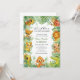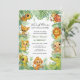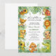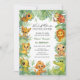 Para o primeiro aniversário do seu menino, vá à loucura com este convite de safári na selva! Perfeito para um tema de festa de aniversário infantil "Um selvagem à solta!", este cartão adorável tem animais de festa como leões, tigres, macacos, raposas, abelhas, tartarugas e crocodilos cercados por verde. Uma maneira vibrante e agradável de comemorar o primeiro aniversário do seu bebê menino.