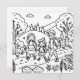 Página de coloração bonita com um tema de acampamento. Uma família caminhando pelas trilhas de caminhada através de árvores e montanhas em sua viagem de acampamento. Cartão de cor bonito para crianças ou adultos.
