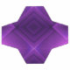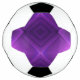 Uma bola de futebol com um padrão geométrico roxo e preto único é mostrada. O design apresenta formas de diamante sobrepostas. Abaixo dela, há um padrão geométrico roxo plano que mostra o layout do design da bola de futebol. A imagem tem um visual moderno e artístico.