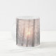 Um sol pálido de inverno se põe atrás de grandes árvores tortuosas como sentinelas escuras. Suas ramificações brilhantes, nuas exceto por uma poeira de neve, e os dourados pastéis, pinks e blues do céu do pôr do sol são vistos como através de uma névoa sonhadora. No primeiro plano, os flocos de neve estão baixando suavemente.