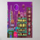 Uma cidade estranha e colorida com um monte de céu roxo, roxo, lua roxa, um arranha-céu estranho. Uma arte estranha única. Esta é uma arte gerada por IA.