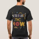 Um design de camiseta com o texto "Navegar no Agora." em letras negrito e geométricas, colocado contra um pano de fundo de formas e linhas coloridas.