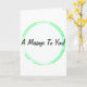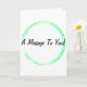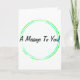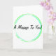 Um cartão de saudação personalizável com um design de círculo simples, colorido e concêntrico impresso na frente. As palavras "A Message to You!" são impressas nos círculos. Você pode alterar o texto na frente e há espaço para você gravar sua mensagem no dentro da placa. Você também pode mudar a cor de fundo da placa, mas ela pode influenciar as cores do círculo concêntrico.