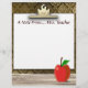Personalize facilmente esta papelaria personalizada timbrada em um clipe de ouro pendurado no bonito papel de parede damask que diz "A Note De..." com qualquer nome. Ou, simplesmente, deixe de fora o texto, apagando-o. Uma maçã vermelha com ilustração verde em folha sobre uma mesa de madeira está no canto inferior. Muito espaço de cópia a ser gravado mais tarde. Excelente de presente pessoal para professores, médicos, enfermeiros, profissionais de saúde, etc. Lembre-se, "Uma maçã por dia, mantém o médico longe!"