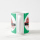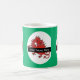 Uma Caneca Ringer verde e branca com um lábio e alça pretos e três pequenos dragões vermelhos giros segurando um lugar para adicionar o nome do dono.
