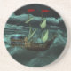 Uma paisagem marinha 3D criada em Vue, mostrando um pequeno navio veleiro com bandeiras vermelhas em um mar com tempestades. Os billows são iluminados com uma luz azul-esverdeada estranha, e as nuvens escuras acima ameaçam mais perigo para o navio.