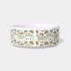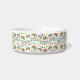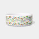 Uma tigela de cerâmica adornada com um padrão colorido de arco-íris, penas e bolinhas em um fundo branco. O design parece alegre e divertido.