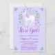 Este convite para chá de fraldas apresenta um design unicórnio floral bonito com elementos faux roxos de brilho. Há um padrão atrás. Personalize-o com seus detalhes.