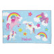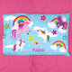 Decorre o quarto ou o berçário da sua menina com este belo e colorido caso de travesseiro unicórnio. O gabinete do travesseiro tem um unicórnio rosa, unicórnio roxo e dois unicórnios brancos. Ao fundo estão lindos arco-íris e nuvens. Adicione o nome do seu filho na base para um toque pessoal.