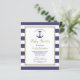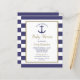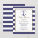 Este convite para chás de fraldas náuticos contém uma âncora azul marinho num retângulo falso revestido com dourado sobre um fundo de faixas de cor azul e branca marinho. Dentro do retângulo, as palavras "Chá de fraldas", o nome da futura mãe, e o prazo RSVP aparecem na tipografia falsa da escrita cursiva em ouro. O texto restante está em marinho azul.