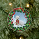 Um ornamento adorável com um Westie que guardara um bastão de doces na neve.