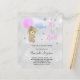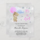 Para um chá de fraldas celebrando uma menina. Um fundo metálico falso prateado, com pó falso prateado. Um ursinho de pelúcia segurando um balão rosa. Personalize e adicione o nome da mãe a ser e os detalhes da festa. O nome e o texto: É uma Rapariga! são escritos com um estilo escrito à mão.