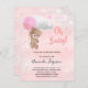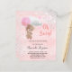 Para um chá de fraldas celebrando uma menina. Um fundo metálico de aparência falsa, cor-de-rosa, com poeira brilhante prateada falsa. Um ursinho de pelúcia segurando um balão rosa. Personalize e adicione o nome da mãe a ser e os detalhes da festa. O nome e o texto: Oh Baby! são escritos com um estilo escrito à mão.