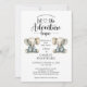 Que a aventura comece o convite de chá de fraldas de gêmeos brancos, com ilustração de elefantes para bebês neutros em termos de gênero. Tipografia de script de caligrafia.