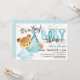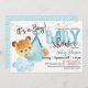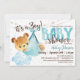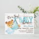 Um convite para chá de fraldas de urso azul. Urso bebê sendo transportado por cegonha. Convite castanho e azul.