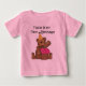 Os t-shirt do primeiro aniversario do bebê, os cartões, o porte postal, os ímãs, os bodysuits, as camisetas longas da luva, as canecas, e mais com um design bonito do urso que caracteriza um urso de ursinho em um chapéu do partido com um cupcake cor-de-rosa do fosco com um iluminaram a vela.